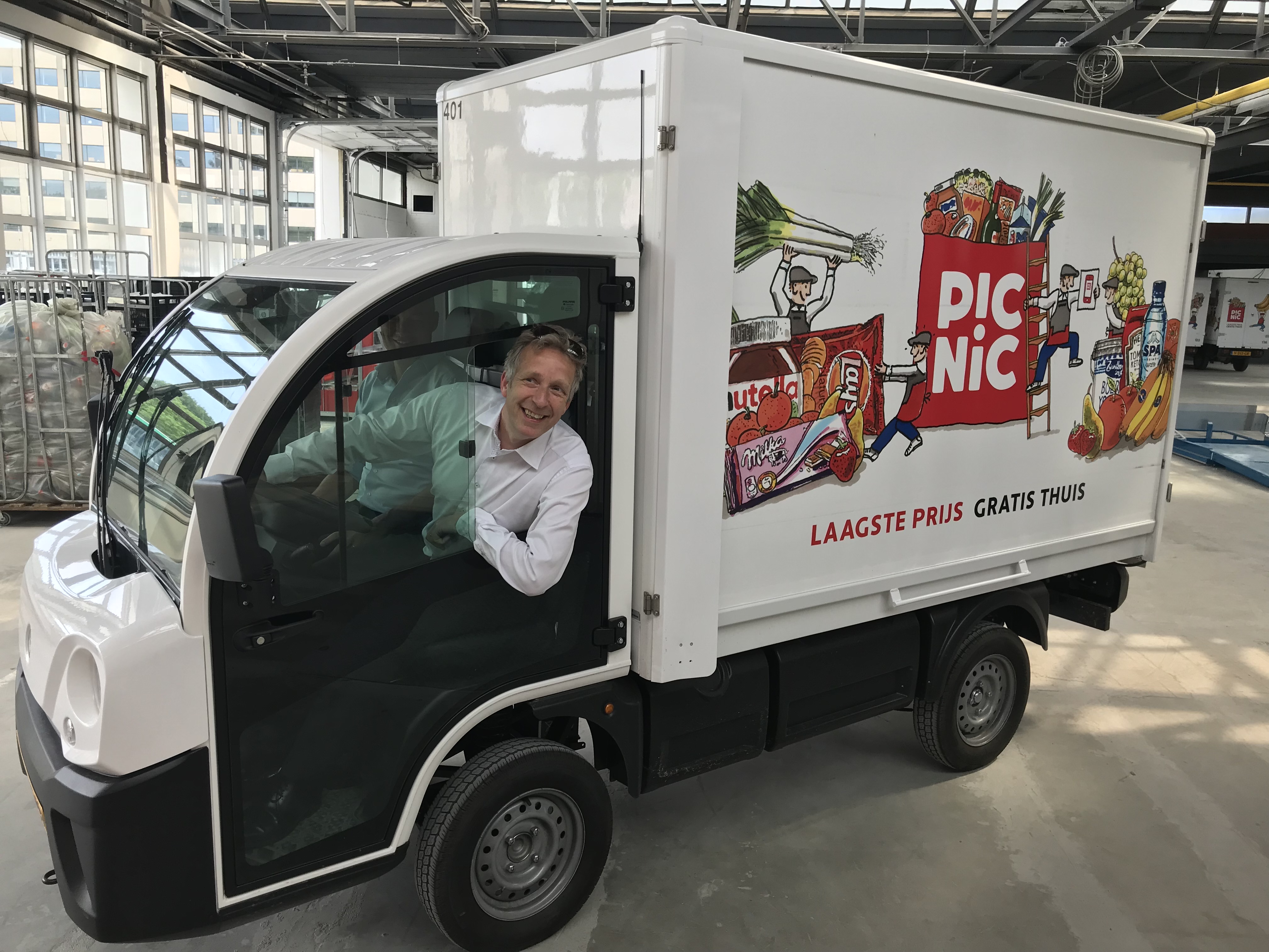 Uw auteur Hans van Tellingen in een Picnic-busje, foto is van mede-auteur Jeroen van der Weerd