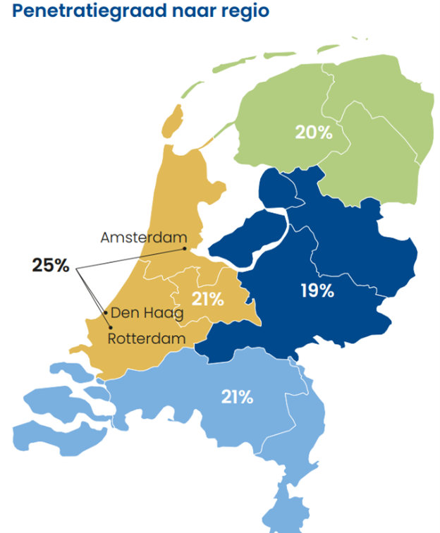In de drie grote steden ligt de penetratiegraad relatief hoog met 25 procent, maar de verschillen met de ‘provincie’ zijn niet al te groot.